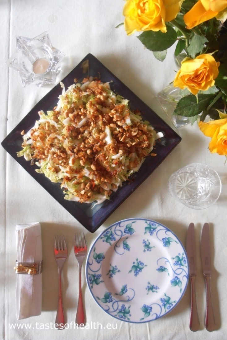 - Transfer the cabbage onto a big serving dish, and sprinkle the top with the fried mixture and the peanuts.